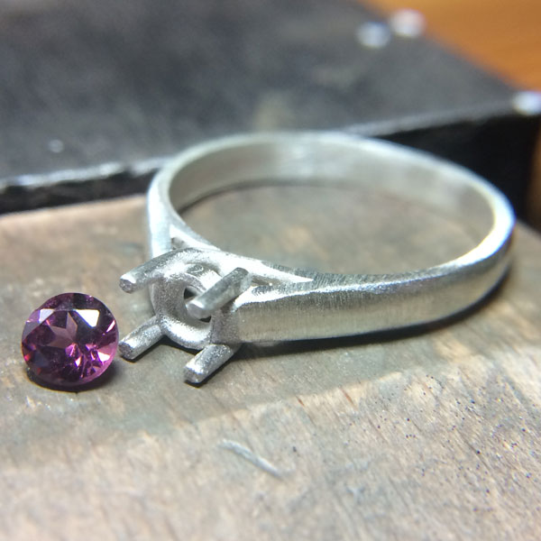 Both were taken using diffused lighting from a daylight lamp at my bench and were taken at a slight angle, this gives an accurate representation of the colour of the stone, which is a Rhodolite Garnet and the Sterling Silver looks like Sterling Silver.