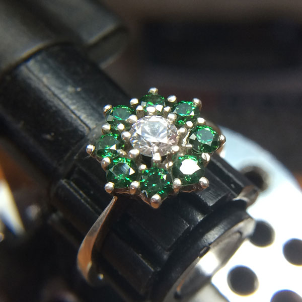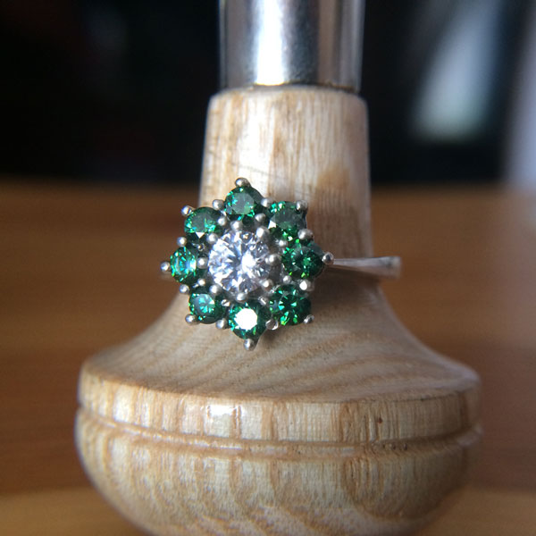 The two images above are the same ring, using the same lighting but taken at different angles. With the straight on image, some of the stones are quite hard to see and the colour doesn’t look quite right (they are CZ’s but very close in colour to a fine quality Emerald). The second image is taken at an angle and the stones are much clearer to see as is the style of setting.